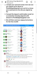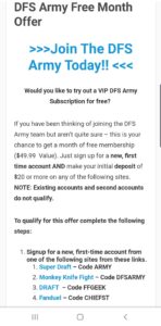 There are numerous options to choose from here, starting with options for free months by joining certain daily fantasy sites and making a deposit of at least $20. You can join Fanduel, Draft, Super Draft, or Monkey Knife Fight, then using codes given to you on the DFS Army website and following the instructions they will give you a free month for each of the sites you sign up for and deposit the $20 into. Thais 4 total free months if you take advantage of all of the sites!
